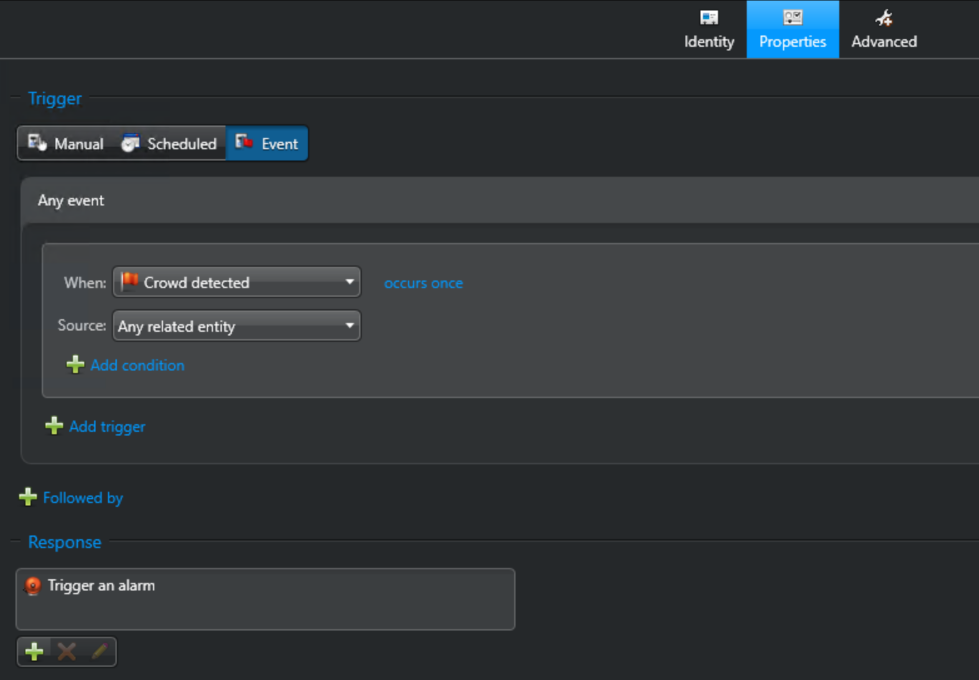 Select Event as the Trigger type. In the When field, select any Event, or the custom event, if you created one in step 4 of Custom event configuration. Select the camera you added in step 3 of Camera registration as the Source.