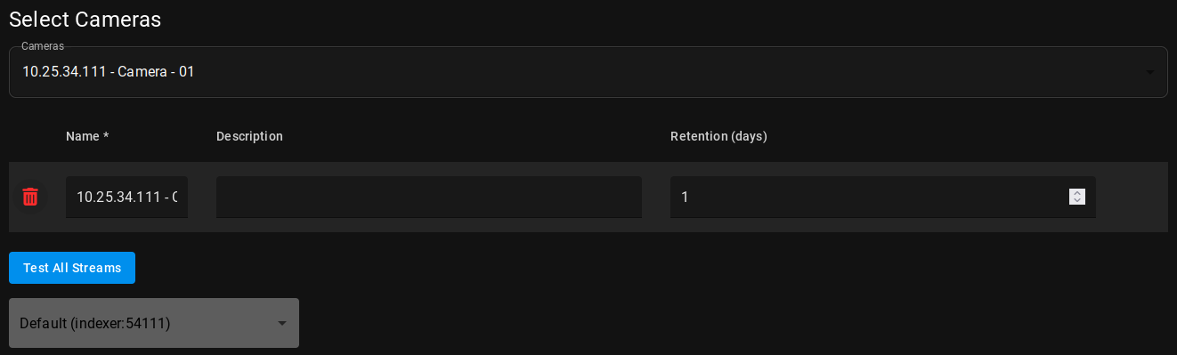 Set the retention time for the cameras in the Retention field (in days, 1 by default), and type a description for them (optional). In case of a distributed system, you can also select the Indexer that will process the video streams from the cameras - otherwise, the default indexer will be used.