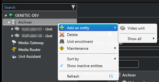 - On the left sidebar, right click Archiver Add an entity Video unit.