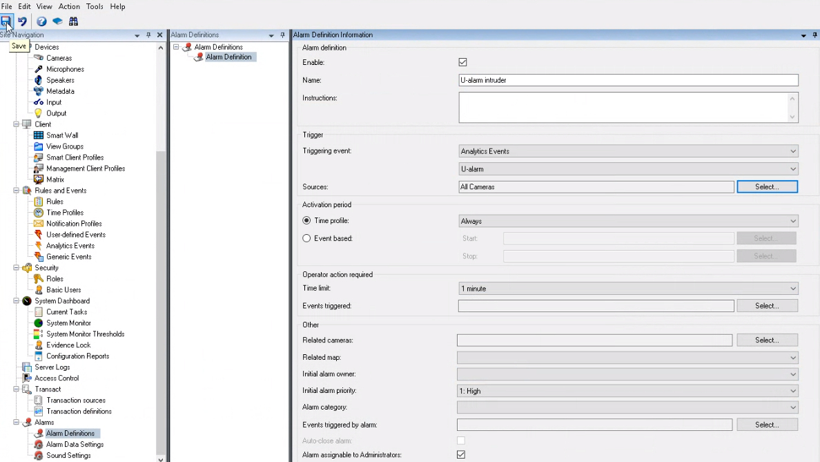 In the Milestone XProtect Management Client, go to the Site Navigation panel Alarms Alarm Definitions.