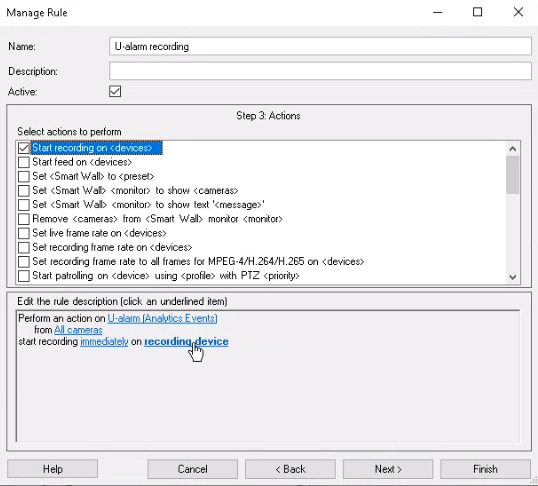 In the Actions Step (3) select Start recording on devices. Click on the blue underlined "recording device" words in the lower panel.