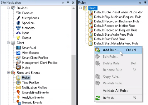 In the Milestone XProtect Management Client, go to the Site Navigation panel Rules and Events Rules.