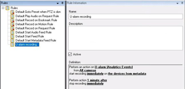 If your system is not recording continuously, it is recommended to start recording on each triggered alarm. A Rule should be created for this purpose.