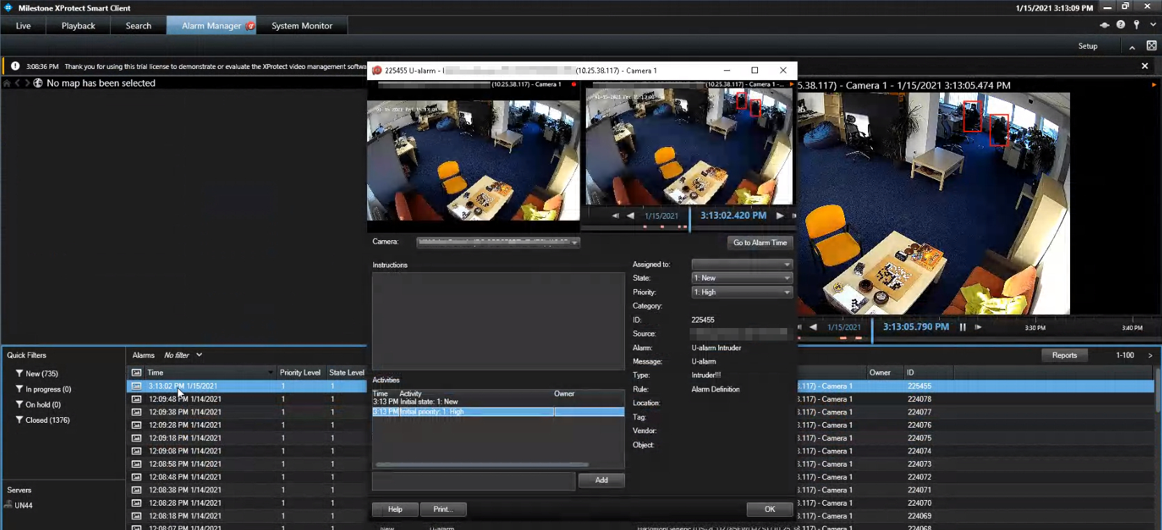 Whenever an Alarm is triggered by IRIS+ Professional, it should be visible in Milestone XProtect Smart Client under the Alarm Manager tab with annotations.