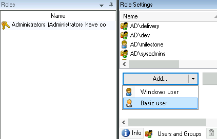 - Find the Users and Groups tab at the bottom of the Role Settings panel. Click the Add... dropdown and select the Basic user option.