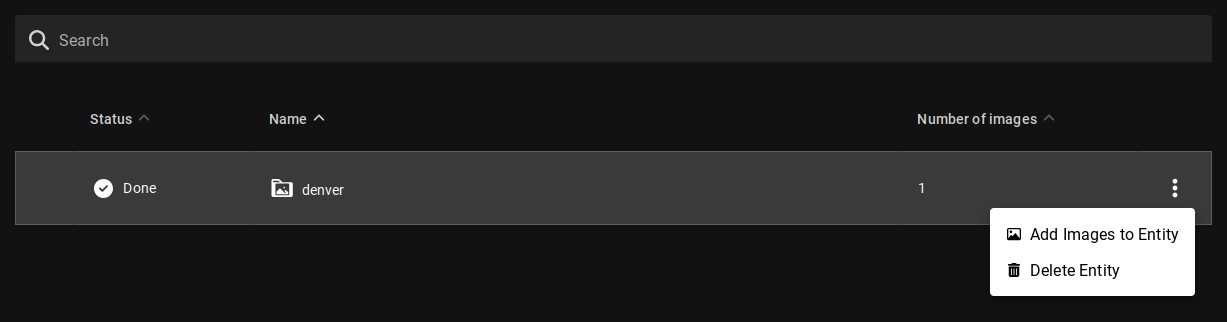 To add images to an entity, click on the menu on its row select Add images to Entity. Upload the folder containing the images you would like to add.