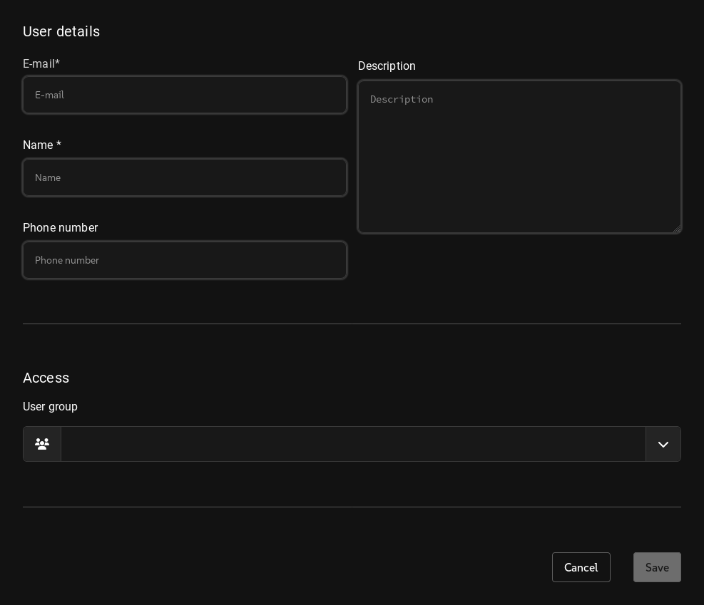 Click the dropdown menu to select the user group to which the user will belong. The user group determines the permissions that the user has in the system. A single user may belong to more than one group. The user group can be changed later.
