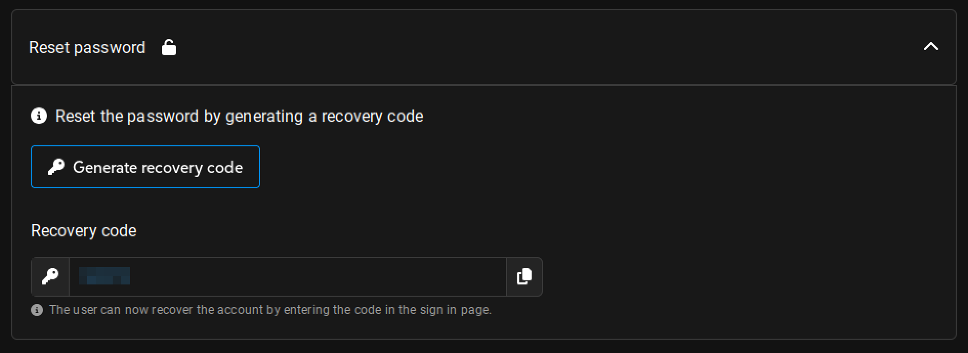 Expand the Reset password section. Click the Generate recovery code button. This will generate a recovery code that can be used to set the user's password. Copy the code to your clipboard.