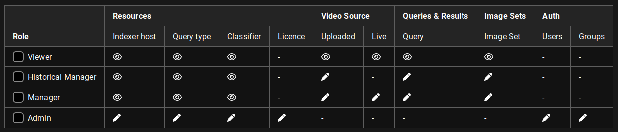 The Manager role has access to running Queries, registering RTSP streams and uploading videos, as well as viewing system settings.
